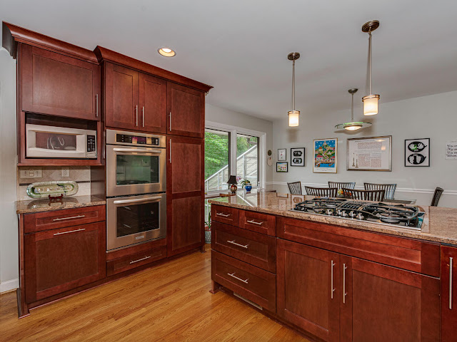 Spacious light-filled kitchen with faux travertine flooring, solid wood cabinets, island, and dining area.