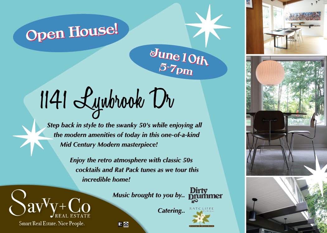 Swanky Schmooze in Sherwood Forest. This Thursday, June 10th from 5 - 7 pm you can rewind to the 50's and relax in Rat Pack style. Shonn Ross with Savvy + Co. will host an Open House cocktail party of one of Charlotte's best modern homes. 1141 Lynbrook Drive in Charlotte's Sherwood Forest neighborhood is hitting the market and whether you are looking for the renovated Mid-Century home of your dreams or just appreciate MCM architecture make sure you put this event on your calendar.
