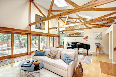 The timber beams are dramatic set against the skylights and glass doors.
